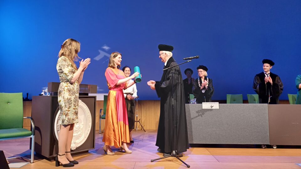 Met de oppositie werden interessante gesprekken gevoerd over de schaling van de resultaten, mogelijk onderliggend leed en het creatieproces van de interventie. Na de verdediging ontving Maria haar bul van promotor Jack Dekker en een mooie laudatio door copromotor Matthijs Blankers. Van harte gefeliciteerd Maria!